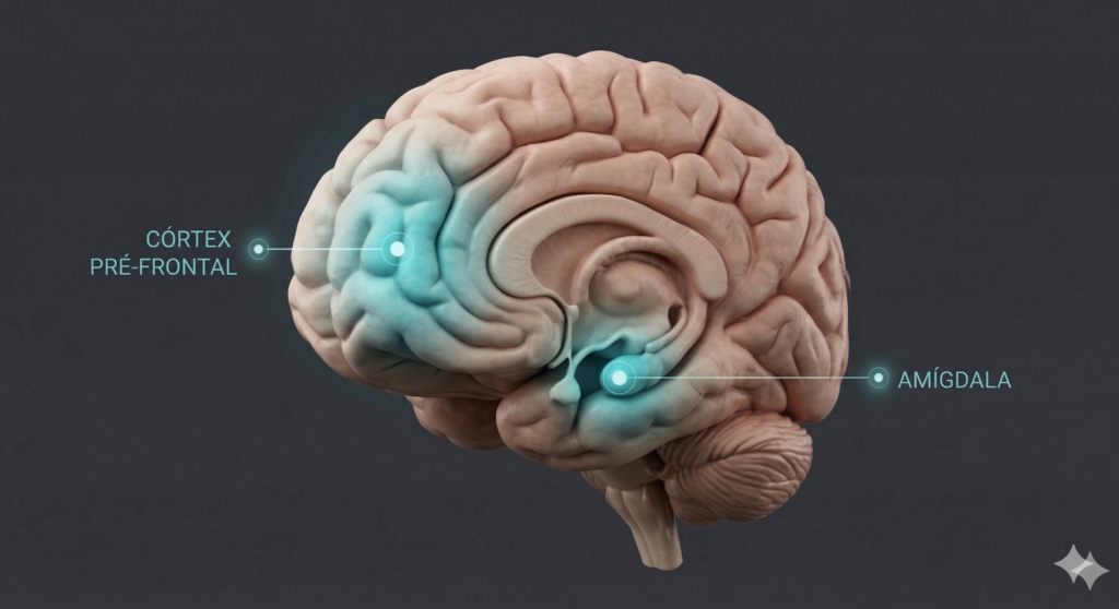 Se o córtex pré-frontal é o CEO, a amígdala é o departamento de segurança e relações humanas. Ela processa as emoções básicas: medo, agressão e, crucialmente, a resposta à dor alheia.