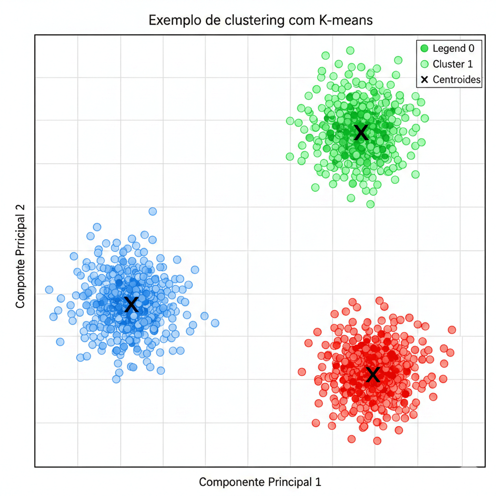 Algoritmos populares incluem K-means, DBSCAN e métodos de redução de dimensão. Como vantagem, essa abordagem é excelente para exploração inicial dos dados. Entretanto, a avaliação dos resultados costuma exigir interpretação humana ou índices internos, como silhouette e Davies-Bouldin.