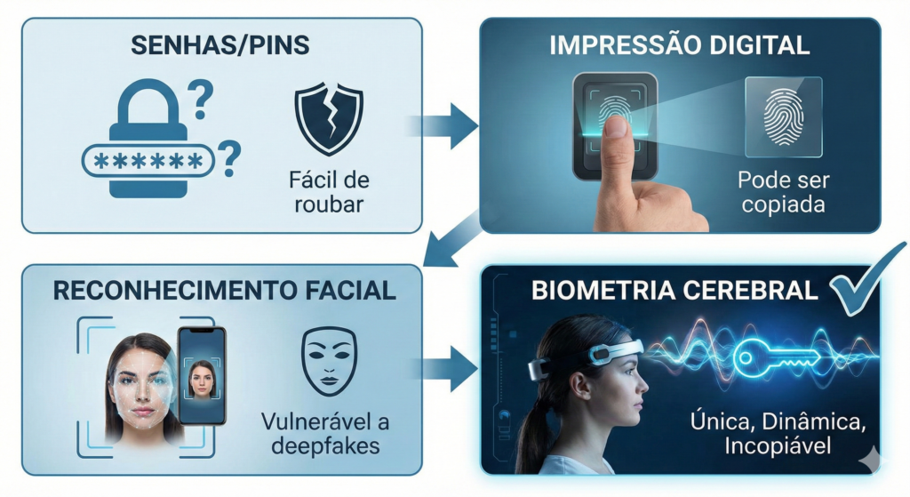 Em resumo, a biometria cerebral representa uma mudança de paradigma fundamental na forma como interagimos com o mundo digital. Ela move a segurança da posse de um segredo externo para a própria essência biológica do funcionamento da nossa mente.