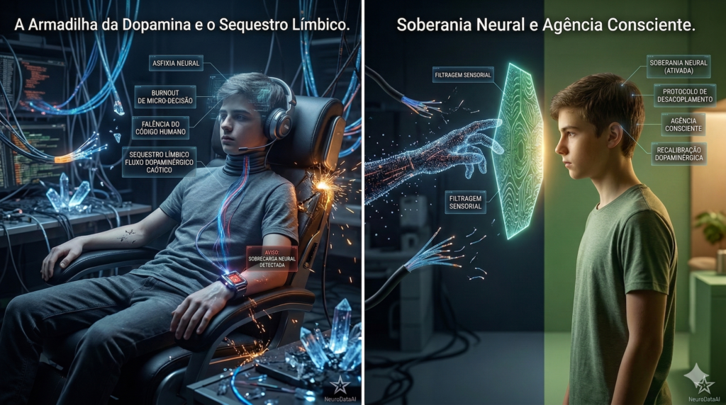 - IAs de Blindagem Local: Em vez de ser o produto das Big Techs, o usuário soberano utiliza agentes de IA que rodam localmente. Esses agentes funcionam como um “firewall de dopamina”, filtrando conteúdos desenhados para disparar gatilhos de ansiedade ou indignação antes que eles cheguem ao seu córtex pré-frontal.