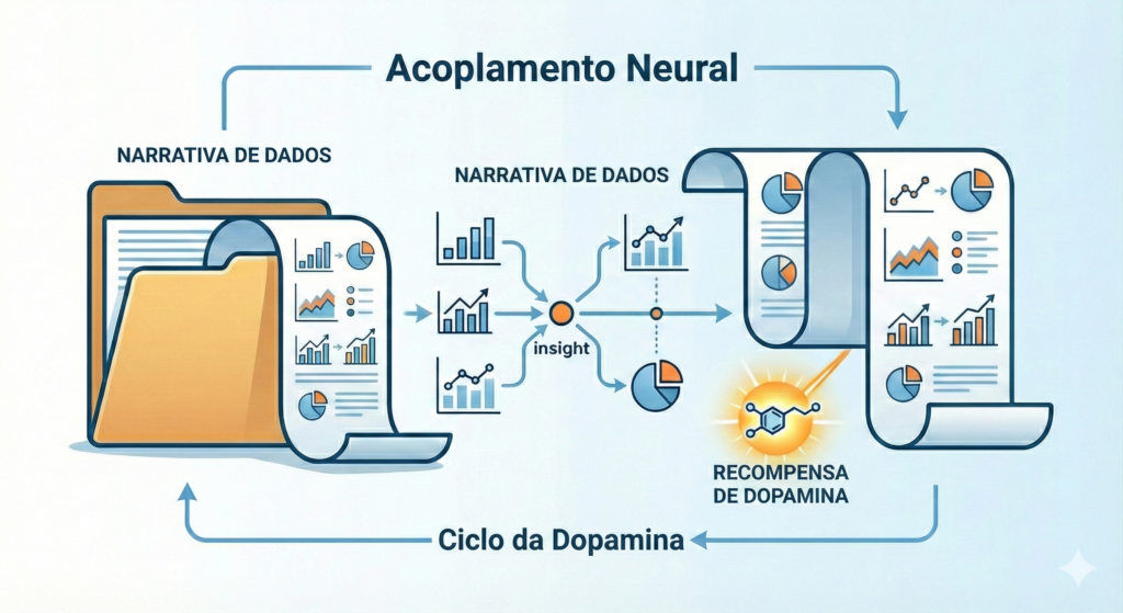 À medida que a narrativa avança para o insight acionável, o cérebro busca ativamente por padrões. Quando a sua visualização permite que o decisor “descubra” a solução, ocorre uma descarga de Dopamina. Nesse cenário, a dopamina não serve apenas para o prazer, mas para a consolidação da memória. Portanto, associar um dado a uma descoberta prazerosa garante que aquela métrica seja lembrada por semanas, e não apenas minutos.