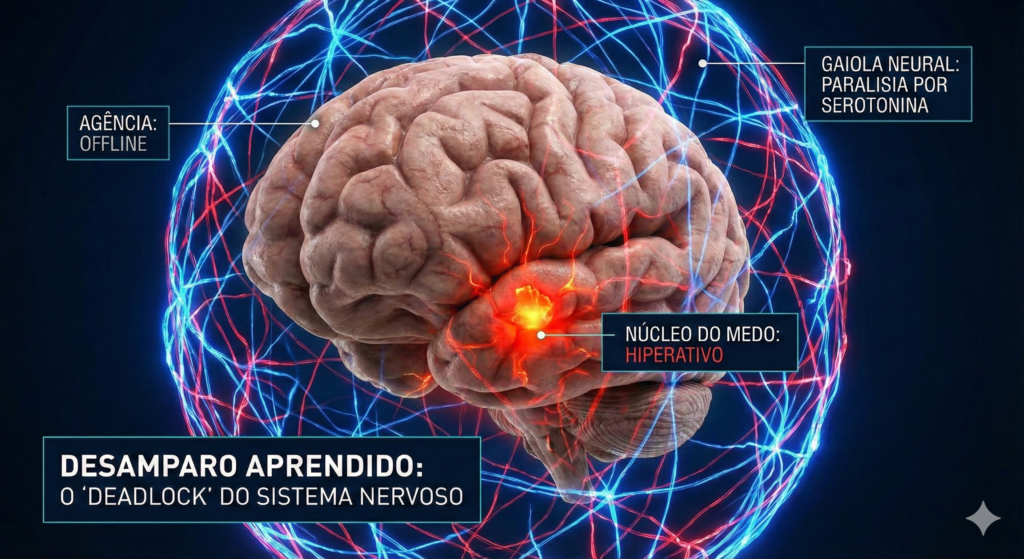 Portanto, o cérebro entra num estado de “paralisia aprendida”. Consequentemente, o sistema límbico bloqueia as vias motoras, impedindo qualquer reacção proactiva. Dessa forma, o indivíduo permanece estático diante da ameaça, pois o seu hardware decidiu que a imobilidade conserva mais recursos do que uma luta impossível de vencer.