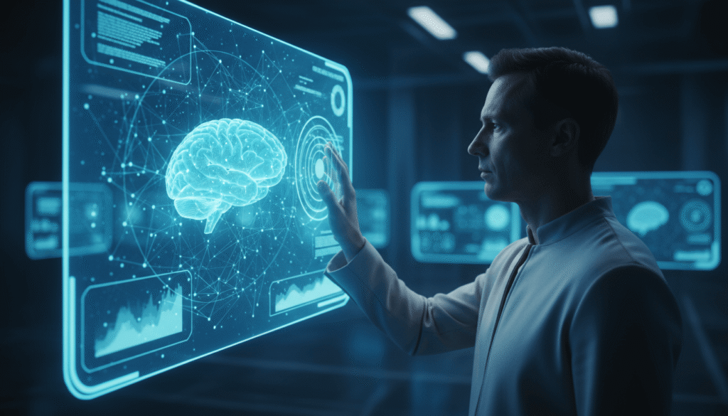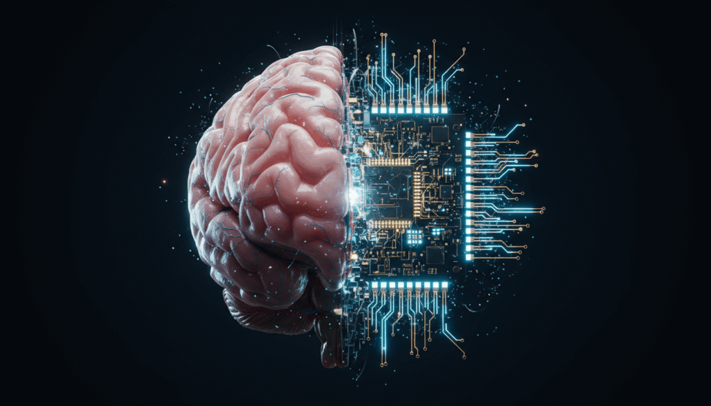“Representação realista de um cérebro humano se conectando a um chip de Inteligência Artificial.”