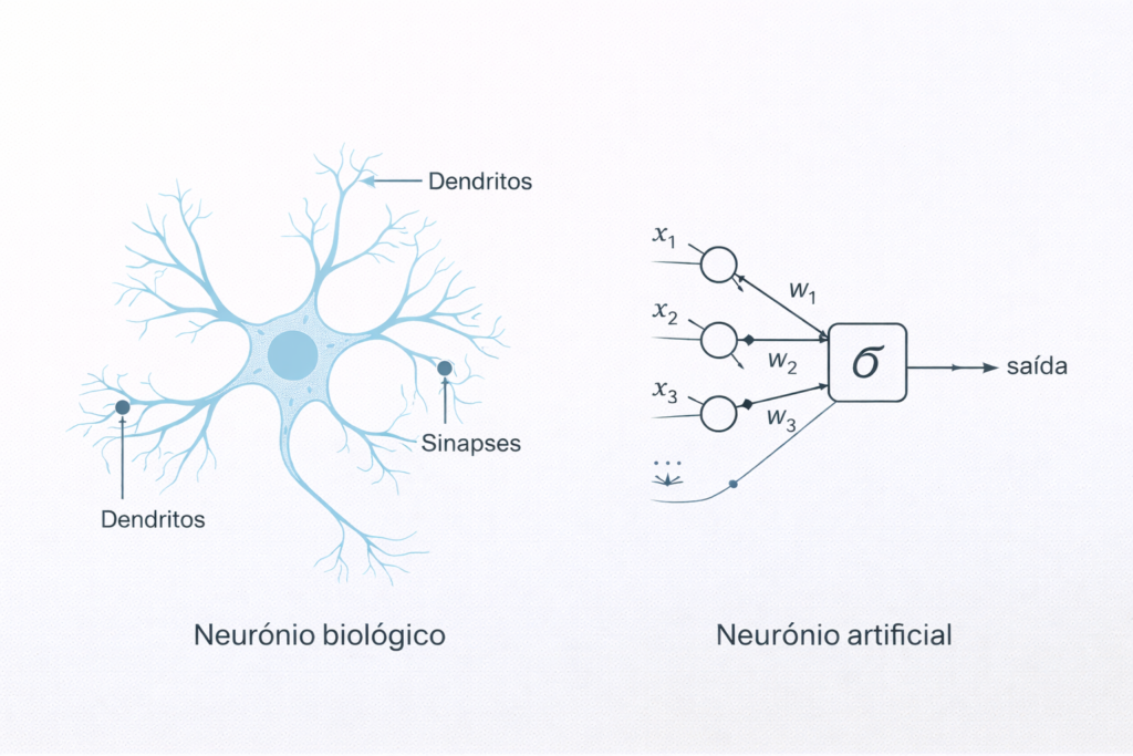 Embora simplificado, esse modelo se inspira na ideia de neurônios biológicos que recebem sinais e disparam respostas.