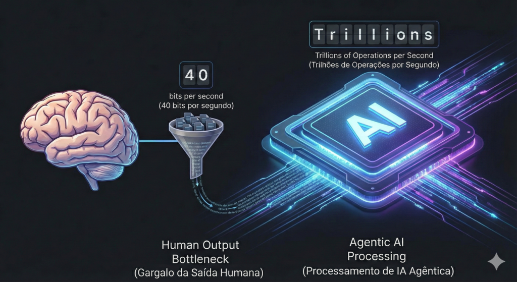A Inteligência Artificial de 2026 processa trilhões de parâmetros em milissegundos. Todavia, a nossa taxa de saída de dados biológica asfixia toda essa potência computacional. Digitar manualmente gera apenas 40 a 60 bits por segundo (bps). Em contraste, a visão humana capta gigabits de informação de forma passiva. Existe, portanto, um desequilíbrio informacional paralisante. Por essa razão, as Big Techs buscam eliminar o intermediário muscular. Elas pretendem conectar o fluxo de dados diretamente ao Neocórtex através de eletrodos e chips.