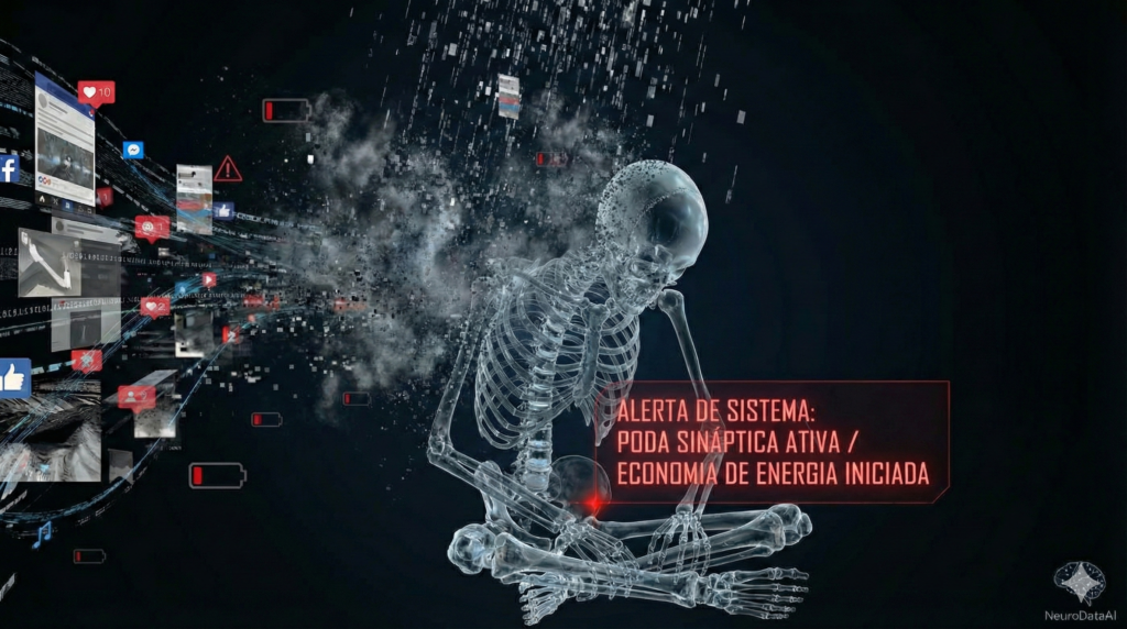 De fato, o cérebro humano é um órgão de elite: consome cerca de 20% de toda a energia do corpo, apesar de representar apenas 2% da massa total. Manter uma única conexão sináptica ativa exige um investimento metabólico constante em ATP (Trifosfato de Adenosina), síntese proteica ininterrupta e a manutenção cara da bainha de mielina. Consequentemente, quando o sistema operativo biológico detecta que um caminho neural — como a habilidade de resolver cálculos complexos, a paciência para diálogos longos ou a capacidade de síntese narrativa — não é “disparado” com frequência, ele inicia o protocolo de Neuroplasticidade Reversa.